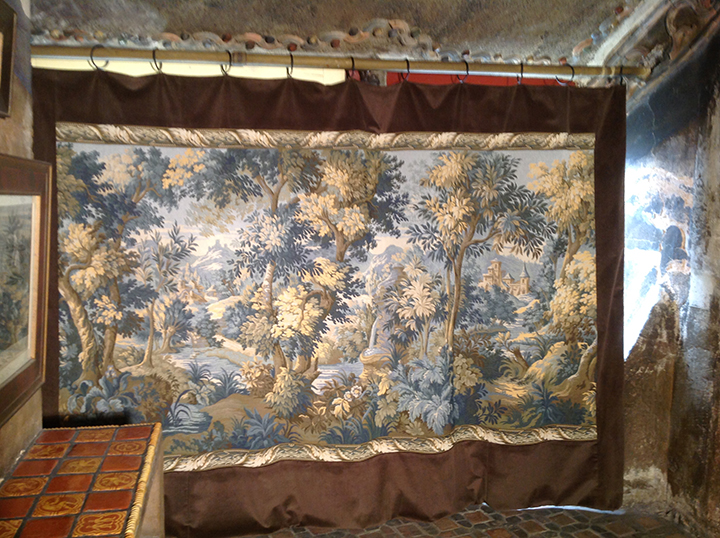 The original window treatments were removed during the 1970’s – 1980’s. This photo of the original was taken after removal. As you can see decades of sunlight faded the Verdure Tapestry and Brown Corduroy Trim that Mercer had used to fabricate the original design.