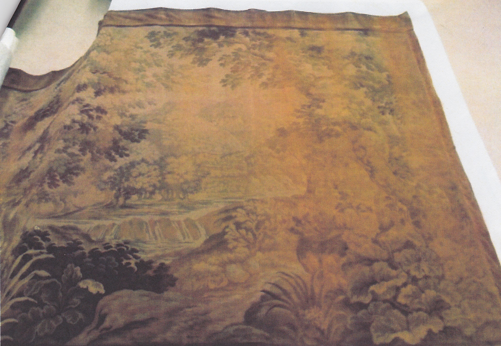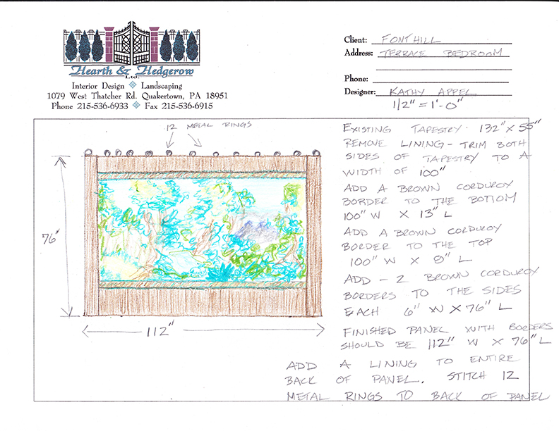 Kathy Appel of Hearth & Hedgerow Ltd. worked with Ed Reidell, Cory Amsler and Sara Good from the Bucks County Historical Society to source materials. A new tapestry featuring the same design motifs as the original Verdure and a matching brown corduroy were specified. Kathy then created a work order that the fabricator could follow to be sure the new piece was the same size as the original.