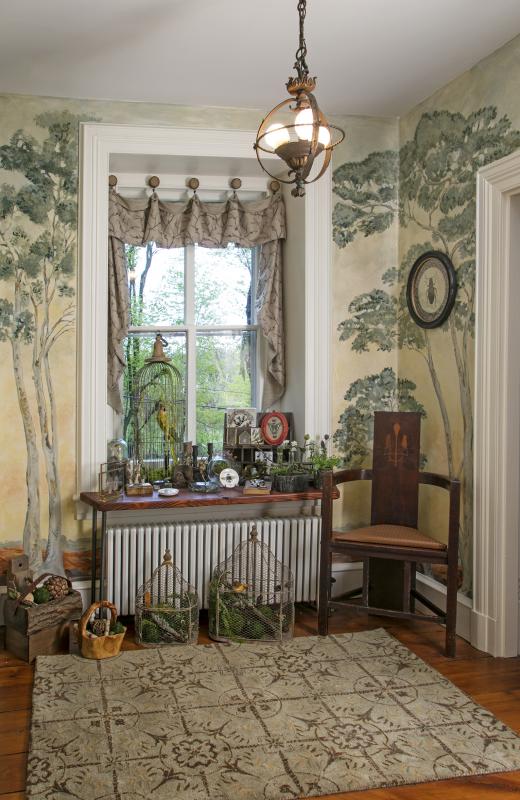 The mural continues through the second floor hall. A handcrafted console table covers the radiator and extends the deep window sill. This created a large area to display a bird cage, plants, terrarium, preserved feathers and other collectibles. The vintage Arts & Crafts corner chair, reproduction Arts & Crafts area rug, wall art and accessories coalesce with the mural and reflect the bucolic view seen through the window.